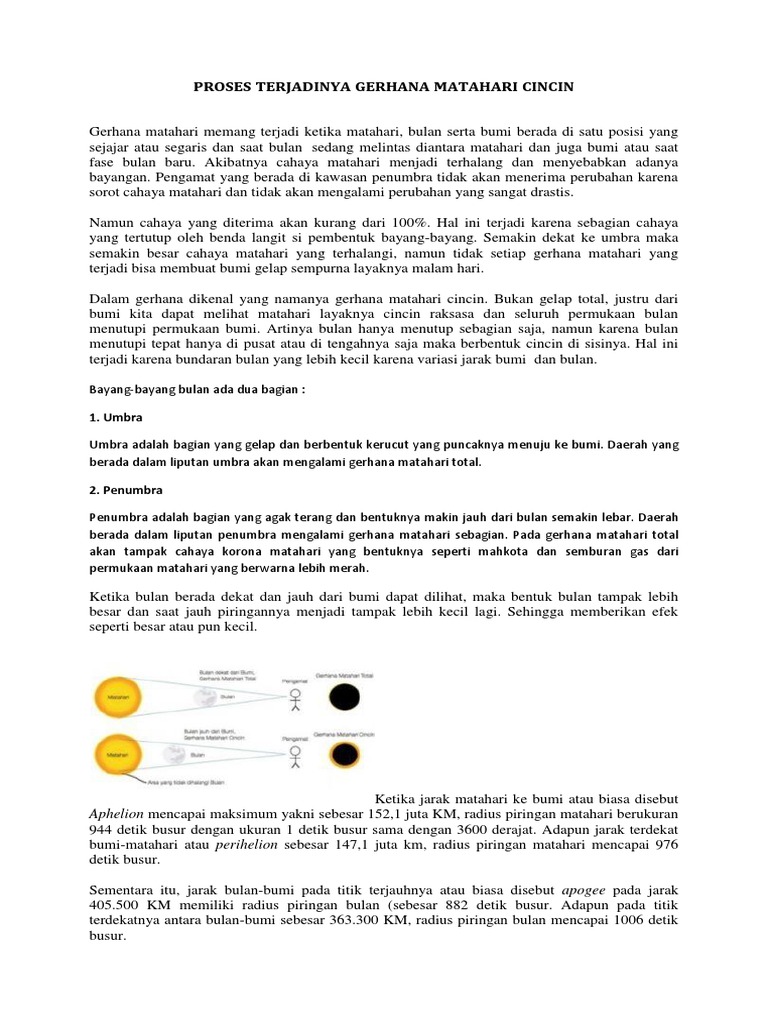 Menurut lembaga penerbangan dan anatariksa nasional (lapan), gerhana matahari terjadi pada saat posisi bulan terletak antara bumi. Pada 26 desember 2019, terjadi fenomena gerhana matahari cincin. Gerhana matahari total terjadi pada saat bulan menutup seluruh cahaya matahari yang mengakibatkan daerah yang tertutupi menjadi gelap. Dilansir dari time and date, setelah 2021, indonesia akan menjadi jalur gerhana matahari pada 20 april 2023 dengan fenomena gerhana matahari total. Ketiga, gerhana matahari cincin yang terjadi bila ukuran piringan bulan lebih kecil dari piringan matahari sehingga bagian piringan matahari yang berada di sekeliling piringan bulan terlihat seperti cincin yang bercahaya. Gerhana matahari dapat terjadi ketika posisi matahari, bulan dan bumi berada pada satu garis lurus. Di indonesia, waktu mulai gerhananya paling awal. Dengan demikian, kondisi yang seharusnya terang perlahan akan menjadi gelap. Gerhana cincin, gerhana ini terjadi bila piringan bulan (saat puncak gerhana) hanya menutup sebagian dari piringan matahari. Gerhana matahari cincin ini akan terjadi pada tanggal 26 desember 2019. Sedangkan puncak gerhana matahari cincin terjadi pada pukul 12.42 wb dan berakhir pada pukul 14.31 wib. Gerhana matahari terjadi ketika posisi bulan terletak di antara bumi dan matahari sehingga terlihat menutup. Sedangkan gerhana matahari cincin terjadi ketika matahari, bulan, dan bumi tepat segaris dan pada saat itu piringan bulan yang teramati dari bumi lebih kecil dari piringan matahari.